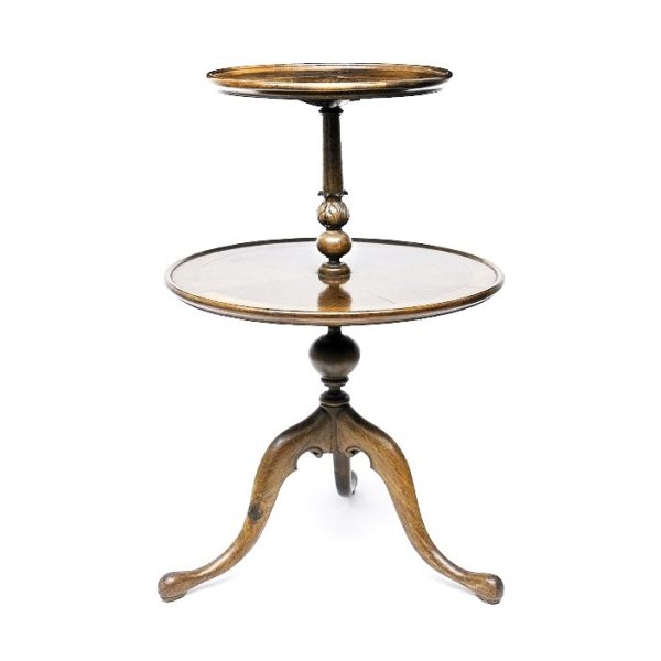 COM DOIS PLATÔS REDONDOS APOIADOS EM EIXO TORNEADO E PÉS TRIPLOS